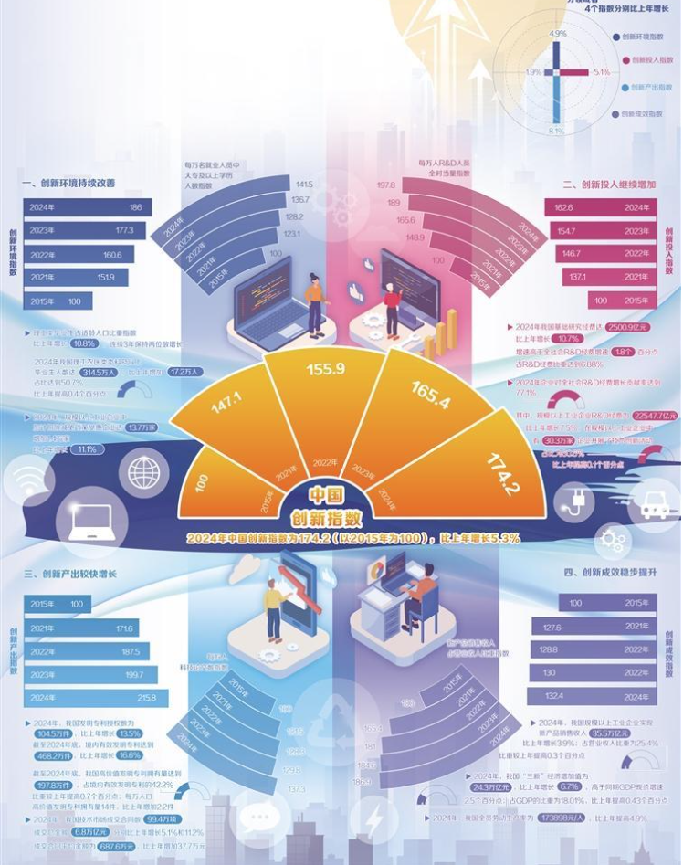 国家统计局数据显示,2024年中国创新指数为174.2(以2015年为100),比上年增长5.3%。中国科技创新能力持续提升,创新产出较快增长,发展新动能不断壮大,为经济高质量发展提供有力支撑。