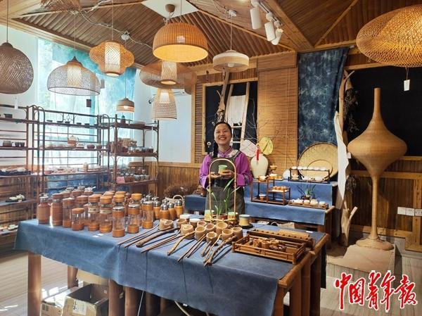 2025年4月18日,贵州省赤水市,牵手竹艺竹编非遗工坊带头人杨昌芹在展示竹编非遗。作为第十三届、十四届全国人大代表,她多次带着赤水竹编去北京。中青报·中青网记者蒋肖斌/摄