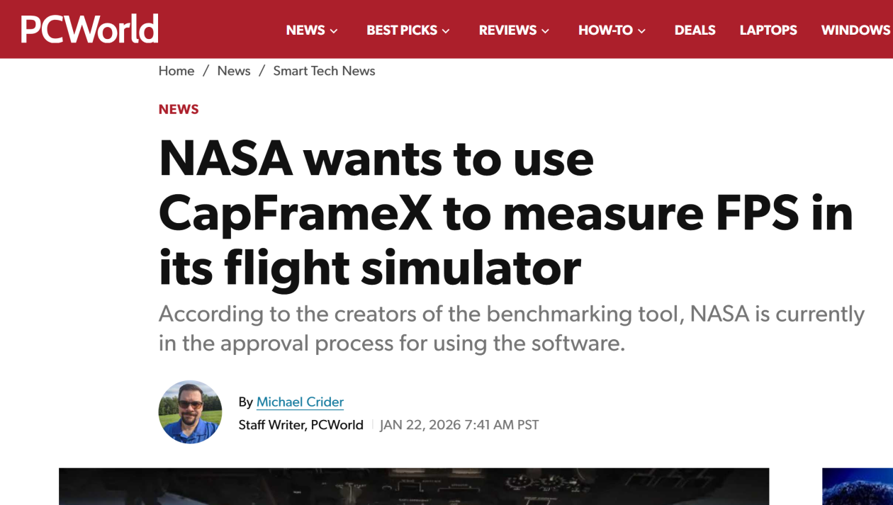 【环球网科技综合报道】1月25日消息,据PCWorld报道,知名PC跑分工具CapFrameX开发团队近日在X平台披露,美国国家航空航天局(NASA)正推进相关软件审批流程,计划采用该工具对飞船驾驶舱模拟器的性能进行评估。值得关注的是,开发团队特别强调,此次合作意向由NASA主动发起,并非开发团队主动接洽。