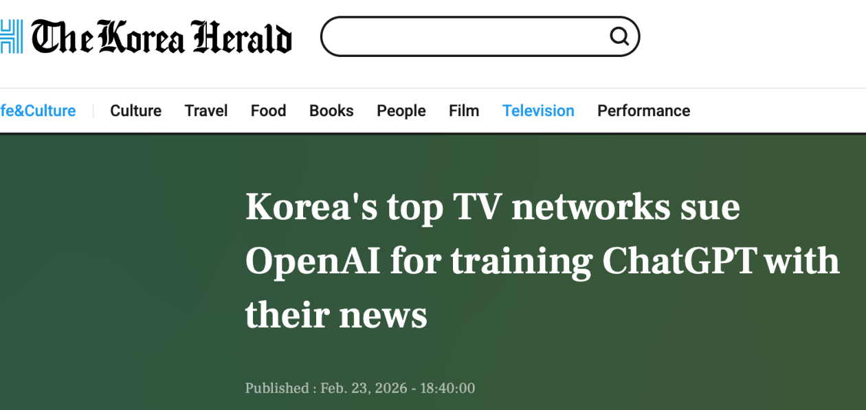 【环球网科技综合报道】2月24日消息,据koreaherald报道,韩国广播协会日前宣布,韩国三大广播公司——KBS、MBC和SBS已正式对OpenAI提起诉讼,指控其在未获授权的情况下,利用三家电视台的新闻内容训练其生成式人工智能模型ChatGPT,并要求法院颁布禁令、停止侵权行为并索赔损失。