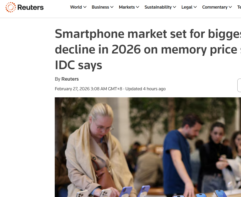 【环球网科技综合报道】据路透社2月27日报道,国际数据公司(IDC)周四发布报告称,受内存芯片价格飙升推动设备成本上涨影响,2026年全球智能手机市场将遭遇史上最大幅度下滑,出货量跌至十多年来最低水平,标志着行业迎来结构性重置。
