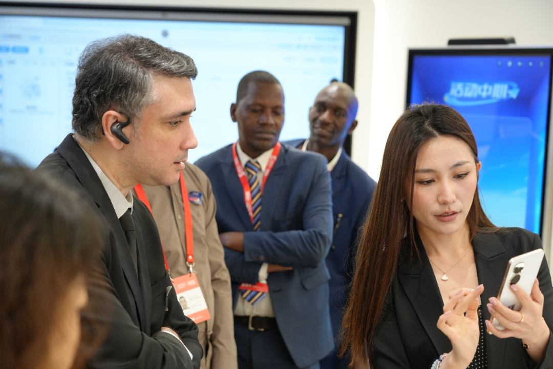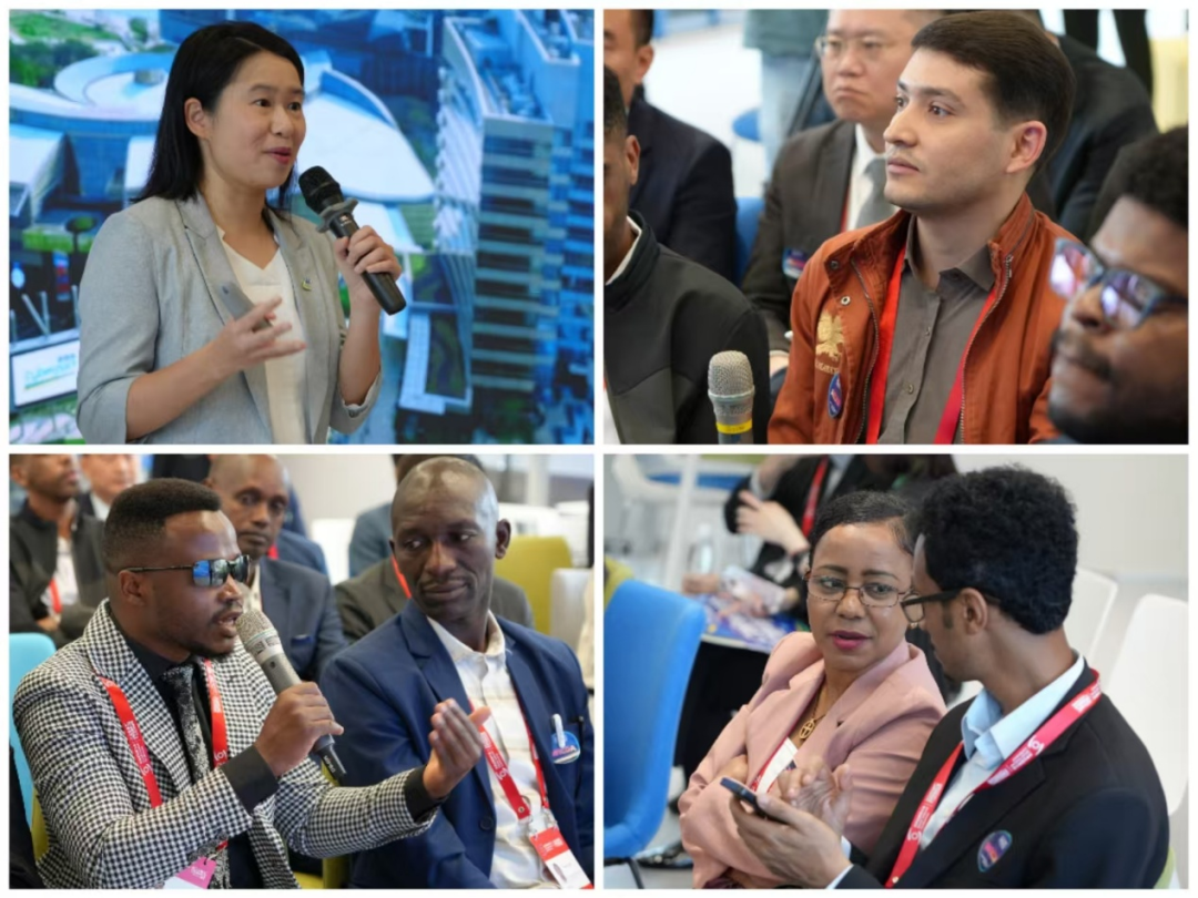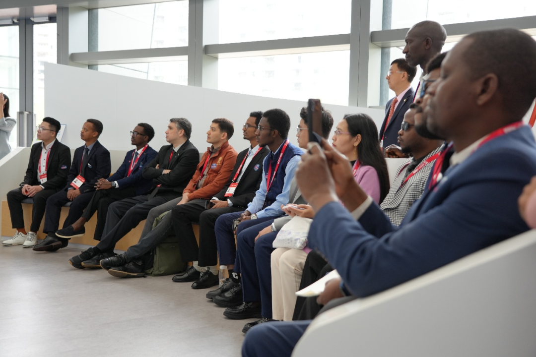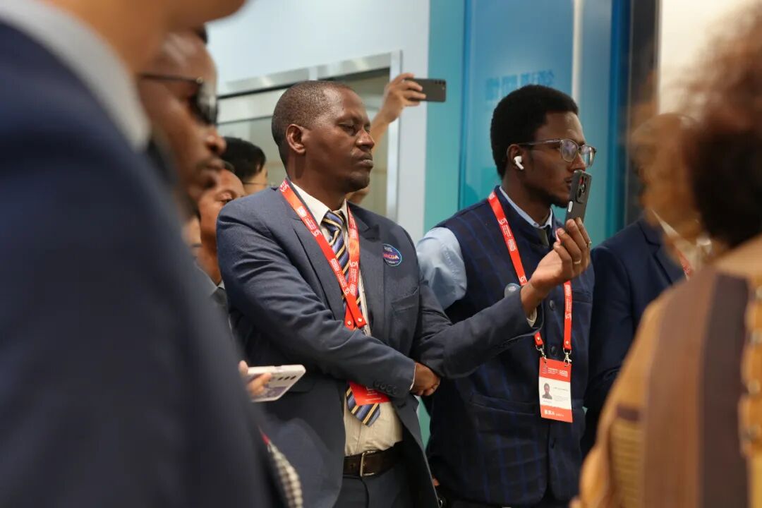 布隆迪通信与媒体部部长助理(图中手持手机)率团参加研学活动,全程专注投入,在互动体验中直观感受科技赋能的创新魅力。
