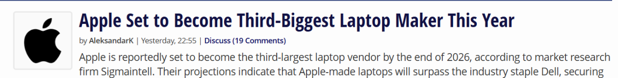 【环球网科技综合报道】4月27日消息,据techpowerup报道,据市场研究公司Sigmaintell预测,苹果有望在2026年底成为全球第三大笔记本电脑厂商。